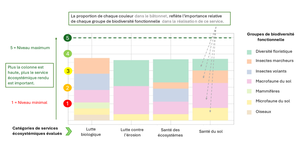 Ce troisième graphique permet de visualiser le niveau de services écosystémiques rendus et la part de chaque groupe d’organismes de biodiversité fonctionnelle par service. Il est accompagné d’une clé de lecture afin d’en faciliter l’interprétation.