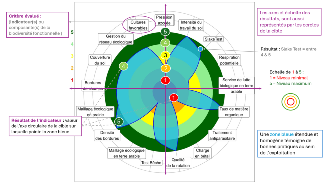 Ce premier graphique présente les résultats obtenus pour chaque indicateur évalué sur une exploitation agricole. Il est accompagné d’une clé de lecture afin d’en faciliter l’interprétation.