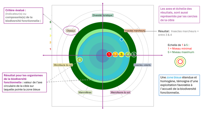 Ce second graphique permet de visualiser les groupes d’organismes de biodiversité fonctionnelle les plus favorisés par les pratiques de l’agriculteur·rice, reflets des résultats des indicateurs. Il est accompagné d’une clé de lecture afin d’en faciliter l’interprétation.