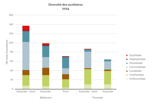 Depuis 2024, Natagriwal mène des essais sur les bandes fleuries promouvant les ennemis naturels des ravageurs. Il apparait que des semis d’automne permettent une couverture hivernale continue ainsi qu’une floraison précoce, durable sur la saison et synchrone avec la période de sensibilité de la betterave aux pucerons vecteurs de jaunisse. Ces jachères d’automne accueillent principalement des syrphes, tandis que les autres familles d’auxiliaires (hors prédateurs généralistes) sont représentées par un faible nombre d’individus en avril-mai (Figure 15). Ces derniers ont probablement hiverné dans l’environnement proche et seraient donc les fondateurs des populations plus abondantes en juin-juillet. Cela témoigne du potentiel attractif de ces bandes fleuries pour les auxiliaires, et ce très tôt dans la saison.