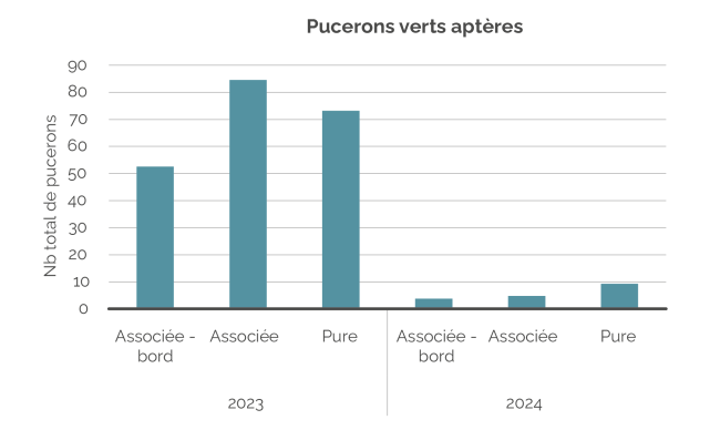 En 2023 et 2024, les pucerons noirs de la fève sont toujours plus abondants lorsque la betterave est associée à la féverole (Figure 4). La féverole abrite donc bien une réserve de ces pucerons qui sont peu problématiques pour la betterave, voire utiles pour alimenter les prédateurs tout au long de la saison. Cet effet est particulièrement visible, surtout en 2024, à proximité des bordures, dans lesquelles les légumineuses sauvages servent probablement de réservoir à pucerons.