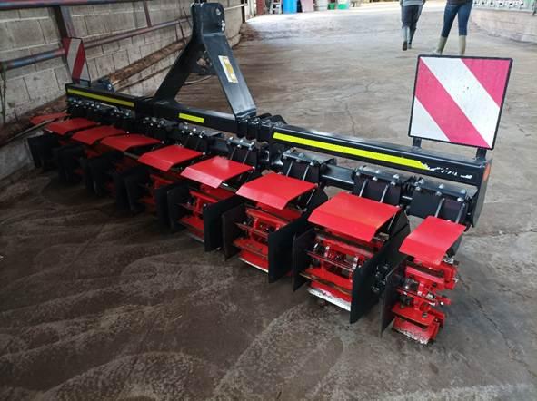 Adrien a dû trouver un moyen d’implanter le blé à l’automne 2023 tout en maintenant le trèfle en place. Après un premier broyage sur l’ensemble de la parcelle le 12 octobre, il est passé avec une fraise dont certaines lames avaient été retirées pour ne travailler que sur des largeurs de 12cm, espacées d’un interligne de 25cm. Il a conçu lui-même l’outil utilisé pour garder la terre dans la ligne travaillée.
