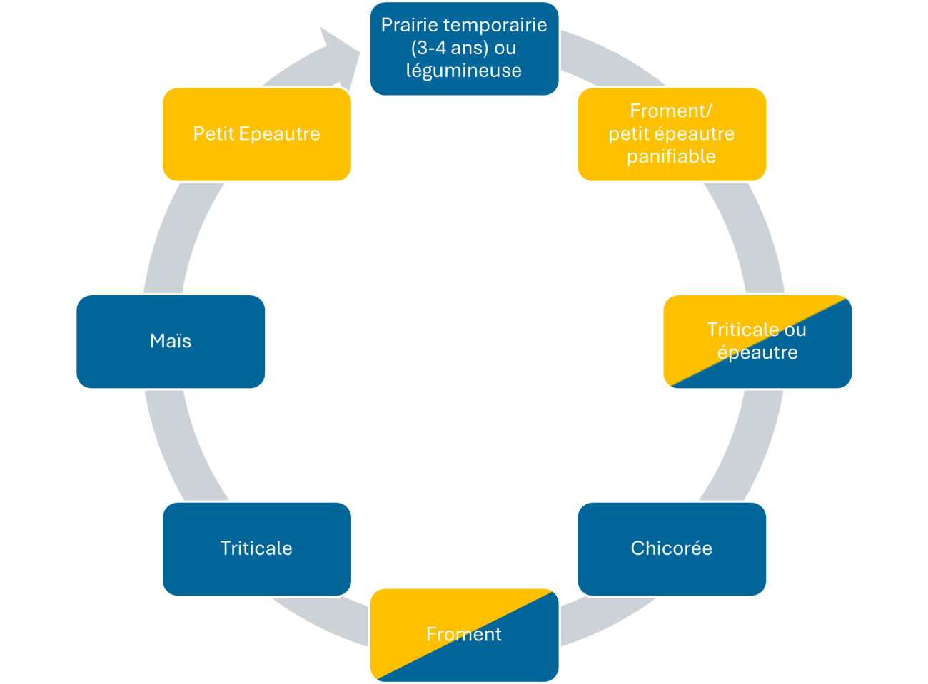Prairie temporaire, féverole, triticale, épeautre, maïs (épis broyé), pois de conserverie, céréales panifiables, chicorée et lentille-avoine.