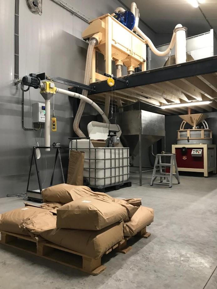 Les céréales sont transformées directement à la ferme grâce à un moulin à meule de pierre de la marque Alma Pro (modèle PRO100). La farine est conditionnée dans des sacs de 25 kg destinés aux artisans boulangers de la région.