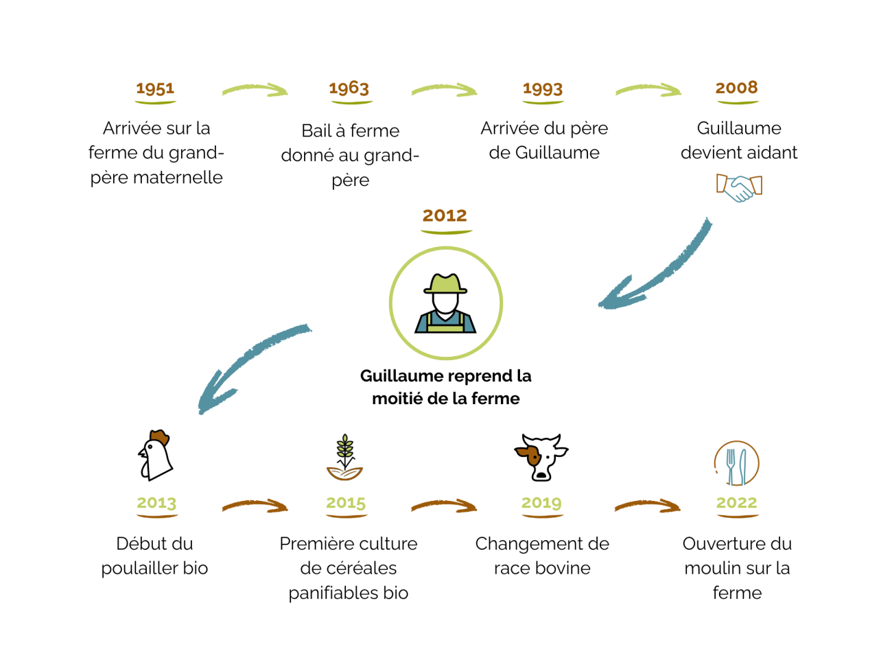 À ses débuts, l’exploitation fonctionne en conventionnel, avec un atelier bovin viande et des cultures fourragères et céréalières. Mais l’équilibre économique est fragile, en particulier du côté des bovins. Guillaume cherche alors un levier de rentabilité, qu’il trouve dans une première diversification en 2013 : le poulailler bio.