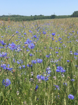 Les terres cultivées sont ainsi parsemées de coquelicots, bleuets et chrysanthèmes des moissons. Ces plantes messicoles ne dérangent pas le couple d’agriculteurs.