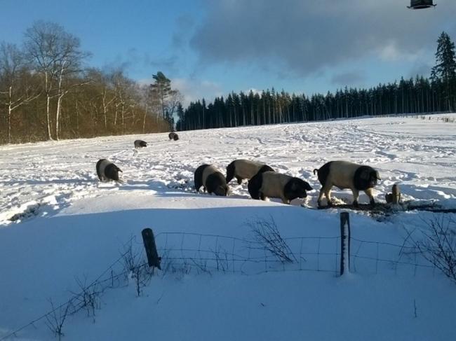 Aujourd’hui, l’atelier porcin compte 20 truies reproductrices et produit environ 300 porcs par an, issus d’un croisement entre Sattleschwein et Piétrain.